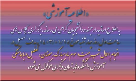 در خصوص عدم برگزاری ساعت اول کلاس های روز چهارشنبه 15 فروردین 1403 بدلیل انجام اعمال شب بیست و سوم ماه رمضان